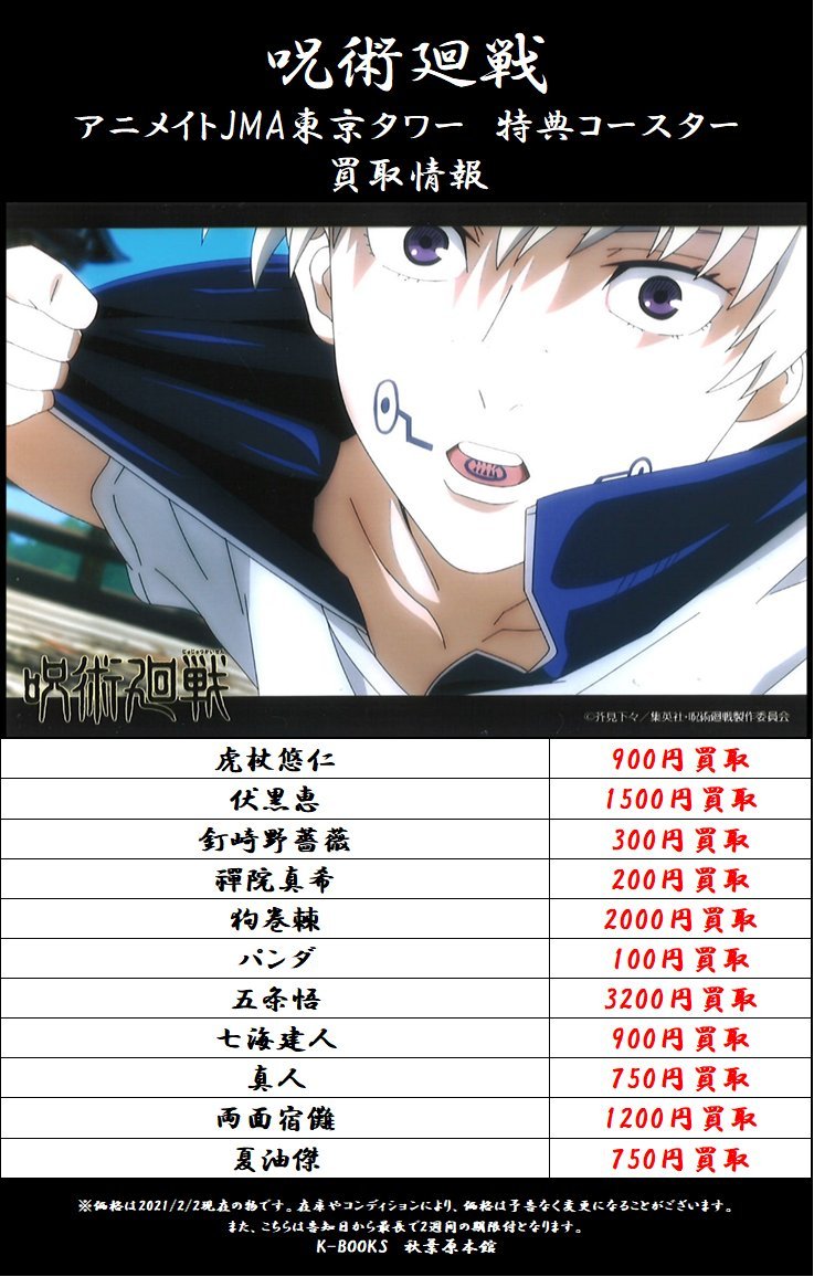 K Books秋葉原本館アニメ ゲームグッズ 買取情報 2 2更新 呪術廻戦 アニメイトjma東京タワー配布 特典 コースター 一部買取価格up アニメイトカフェコラボグッズ 缶バッジ アクリルスタンドキーホルダー 大募集中です W Kbooks 交換が